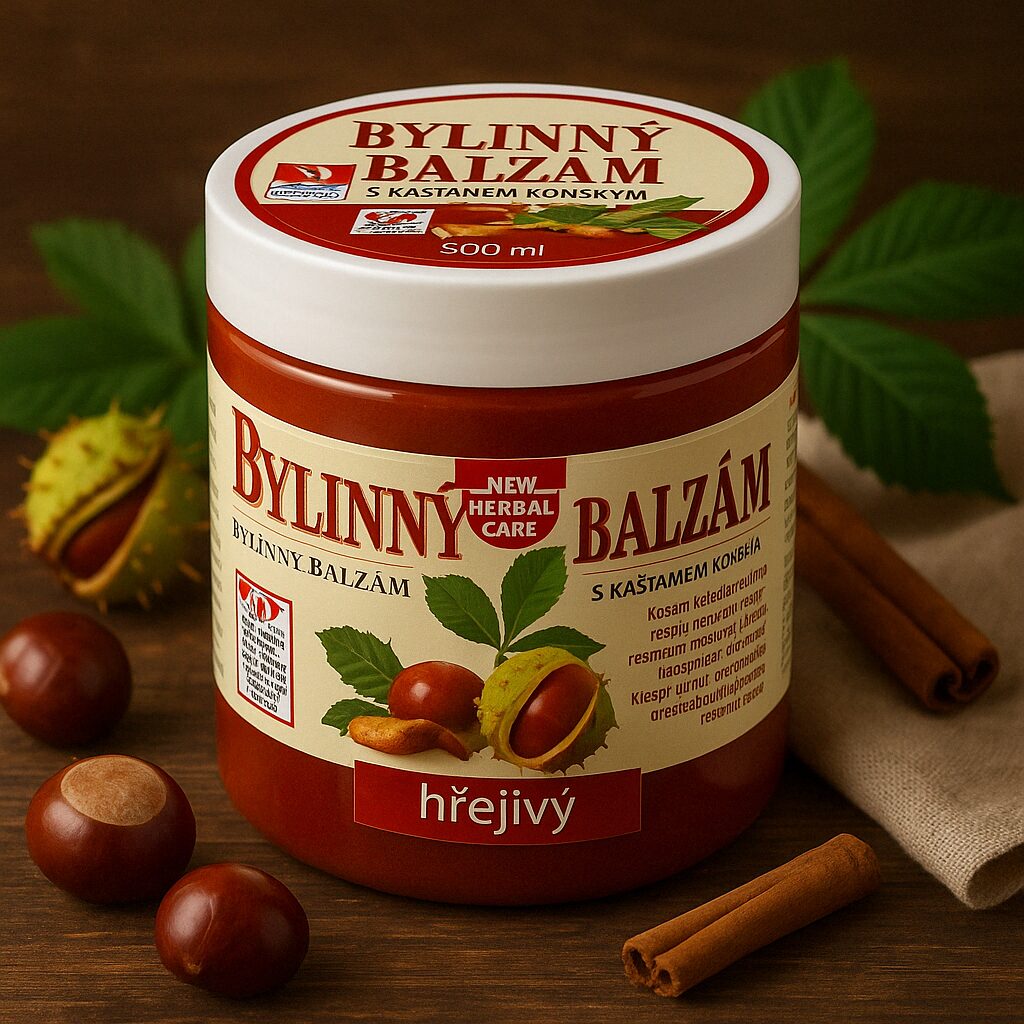 🌰 Bylinný balzám s Kaštanem Koňským Hřejivý 500 ml – Úleva po Námaze, Zklidnění a Regenerace
