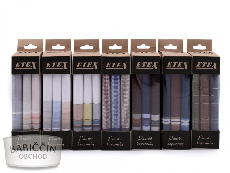 Sada pánských kapesníků kvalitní české výroby, je zabalená v papírové krabičce s průhledem. V jedné krabičce jsou 3 kapesníky, které mají čtvercový tvar o rozměru